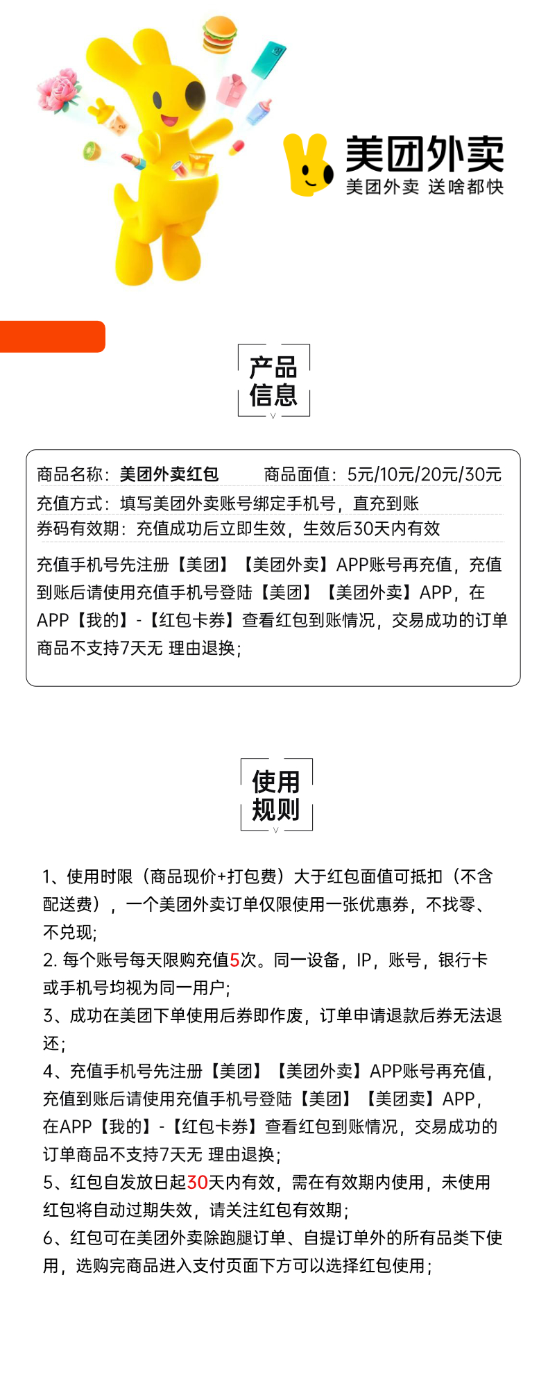 首页 > 商品目录 > 【直充秒到】美团外卖红包30元无门槛通用红包丨1天5次